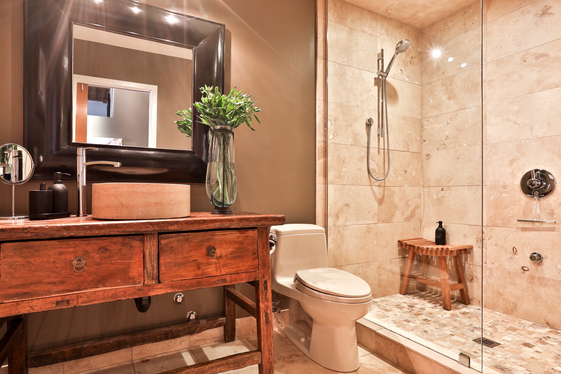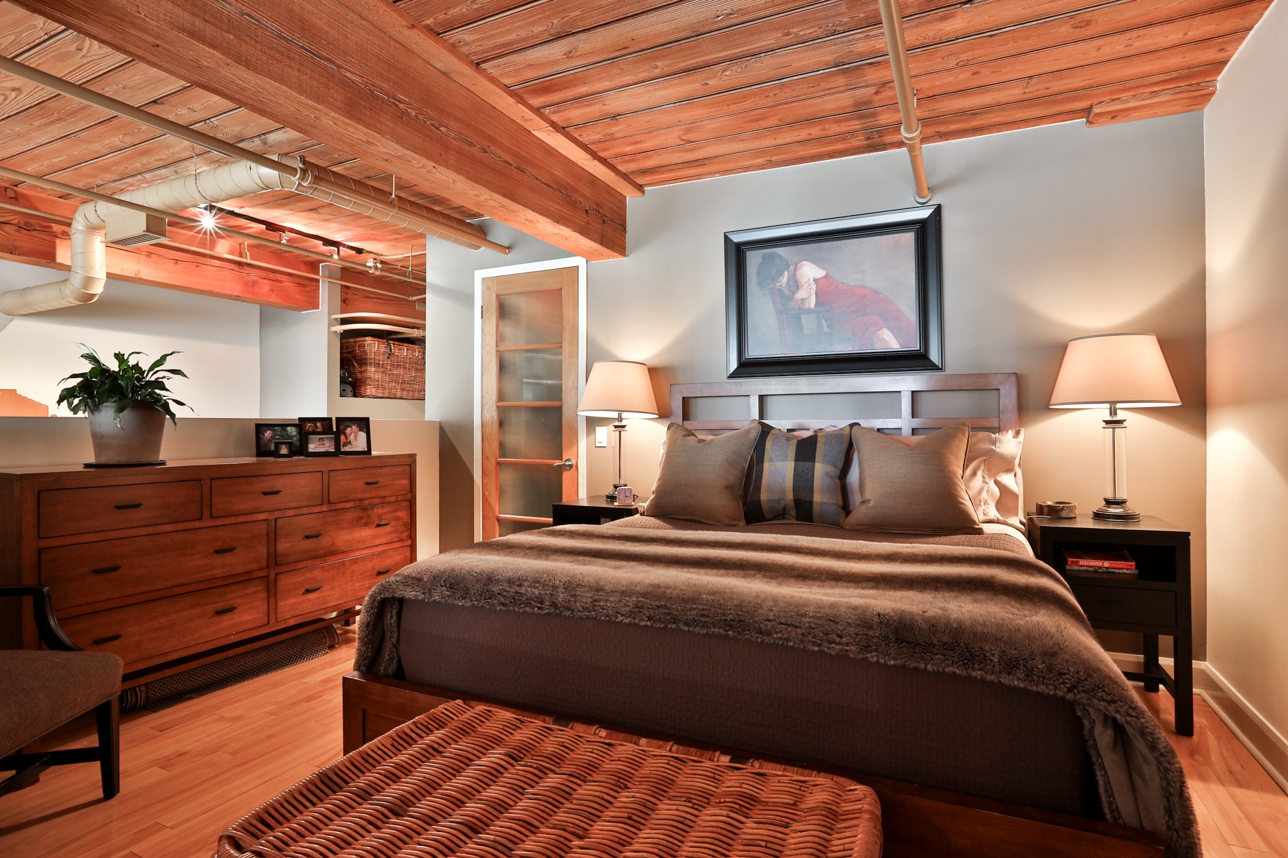 The main bath was redesigned by the current owner and features an oversized shower with steam, and an adjacent walk-in closet for extra storage – one of two walk-ins, with the second next to the bedroom.  Speaking of which, the bedroom is elevated and cosy space, creating abundant storage below.