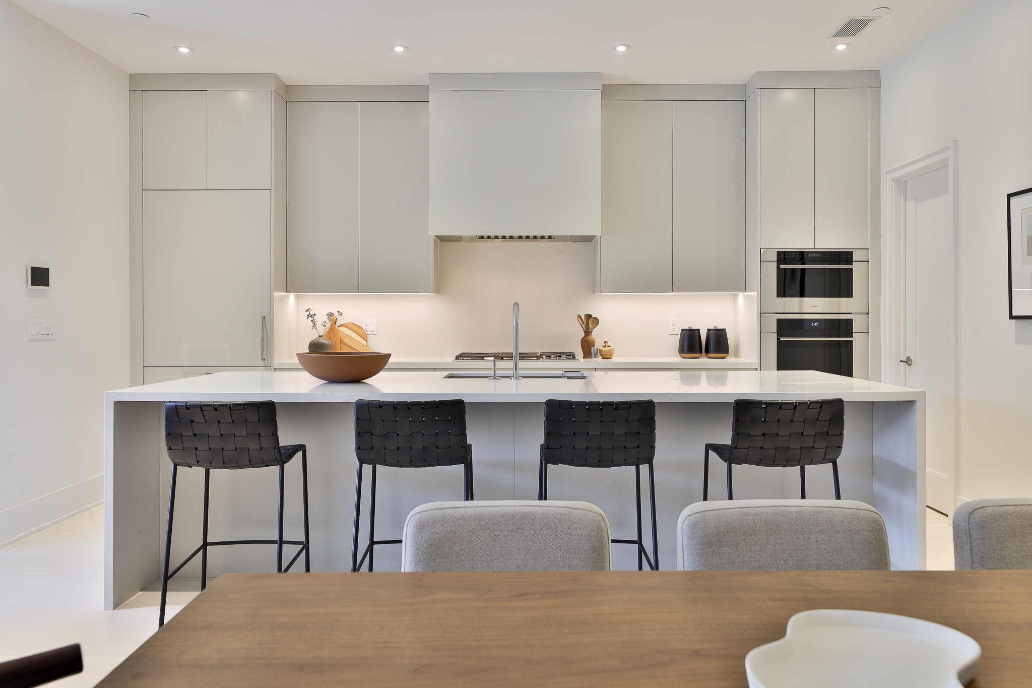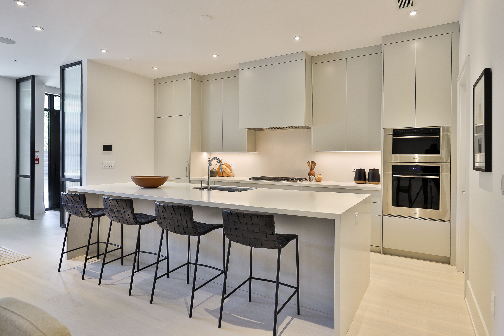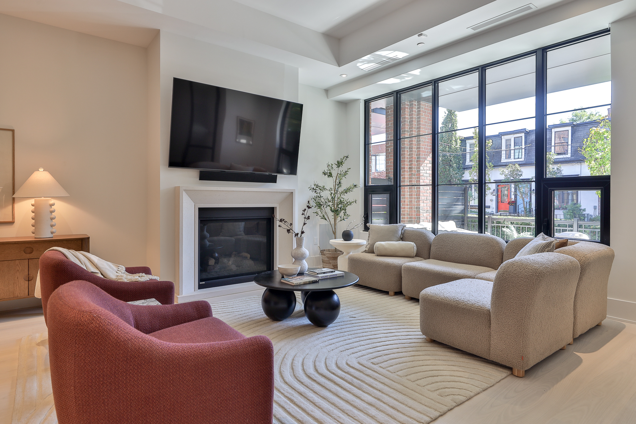 The main level impresses with soaring 11-foot ceilings and a gracious living room anchored by a gas fireplace. Wide-plank hardwood floors and upgraded finishes create a refined backdrop for everyday living. The modern, full-sized kitchen features integrated Wolf and Sub-Zero appliances, generous counter space, and a discreet walk-in pantry — ideal for both entertaining and daily routines.