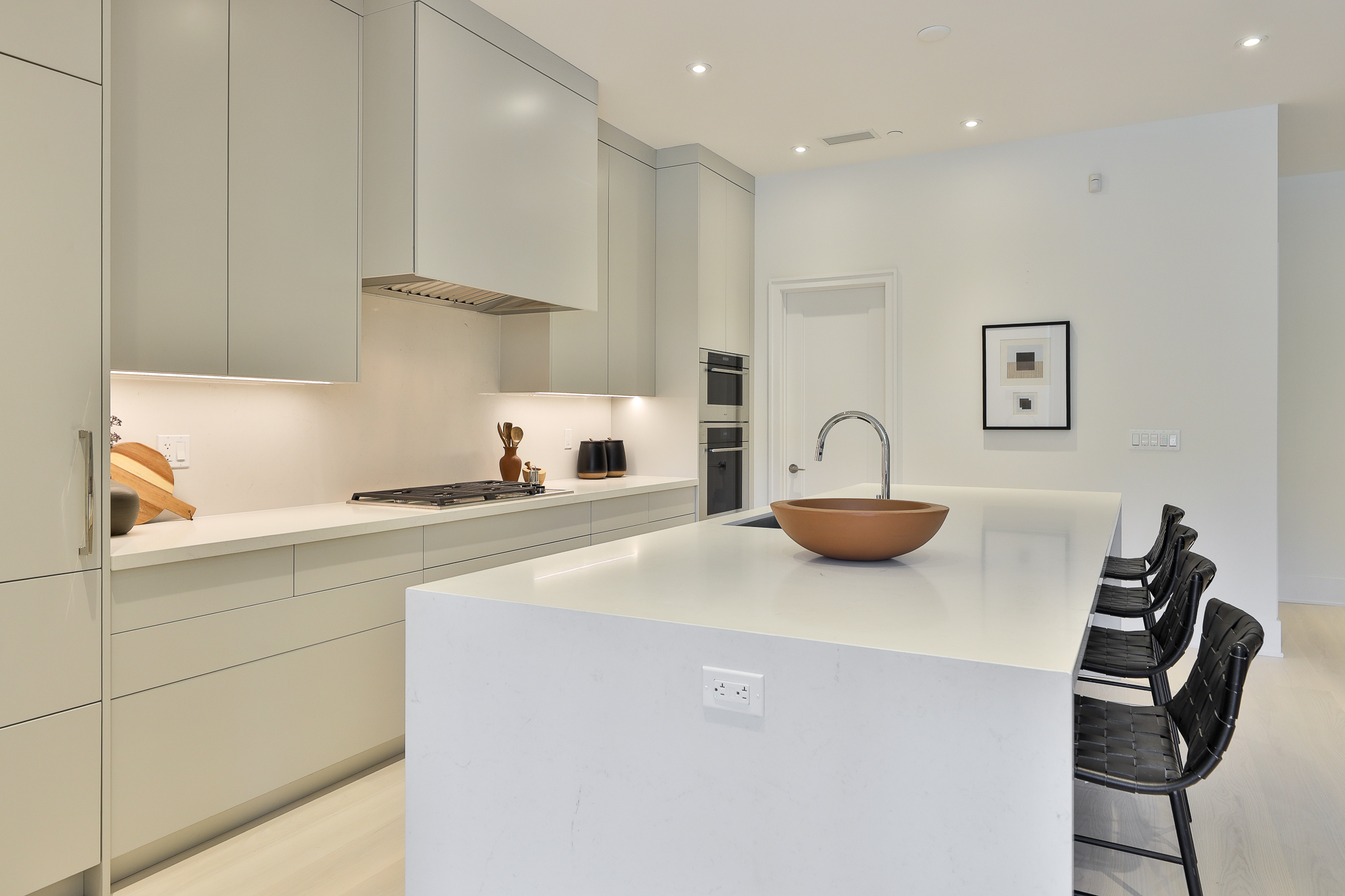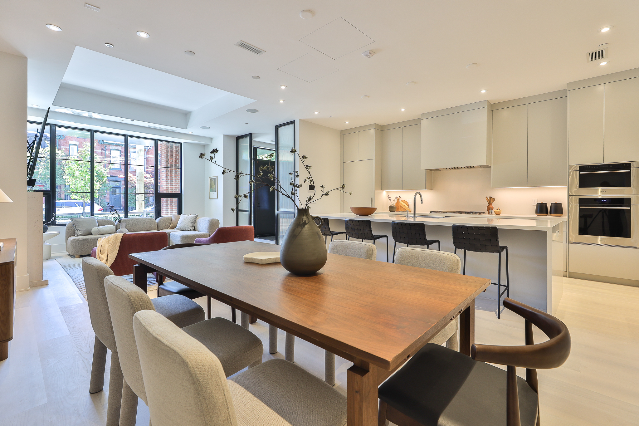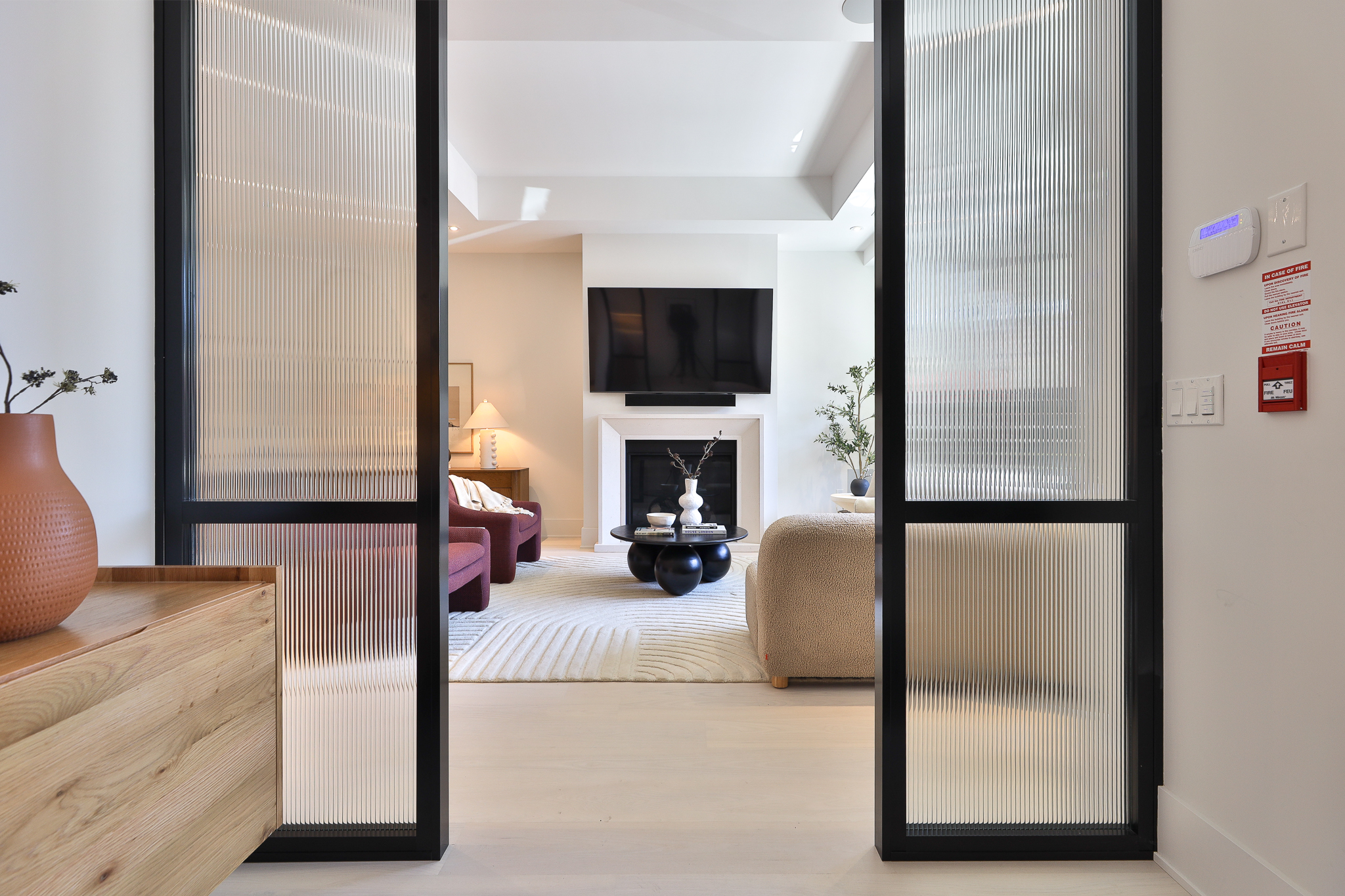 The main level impresses with soaring 11-foot ceilings and a gracious living room anchored by a gas fireplace. Wide-plank hardwood floors and upgraded finishes create a refined backdrop for everyday living. The modern, full-sized kitchen features integrated Wolf and Sub-Zero appliances, generous counter space, and a discreet walk-in pantry — ideal for both entertaining and daily routines.