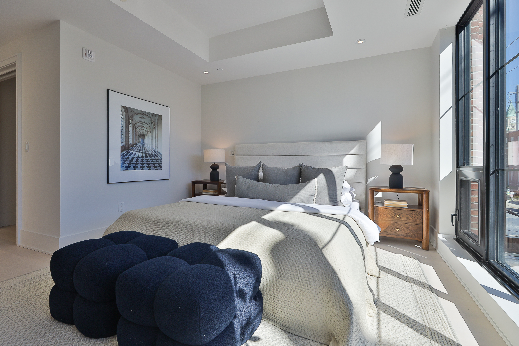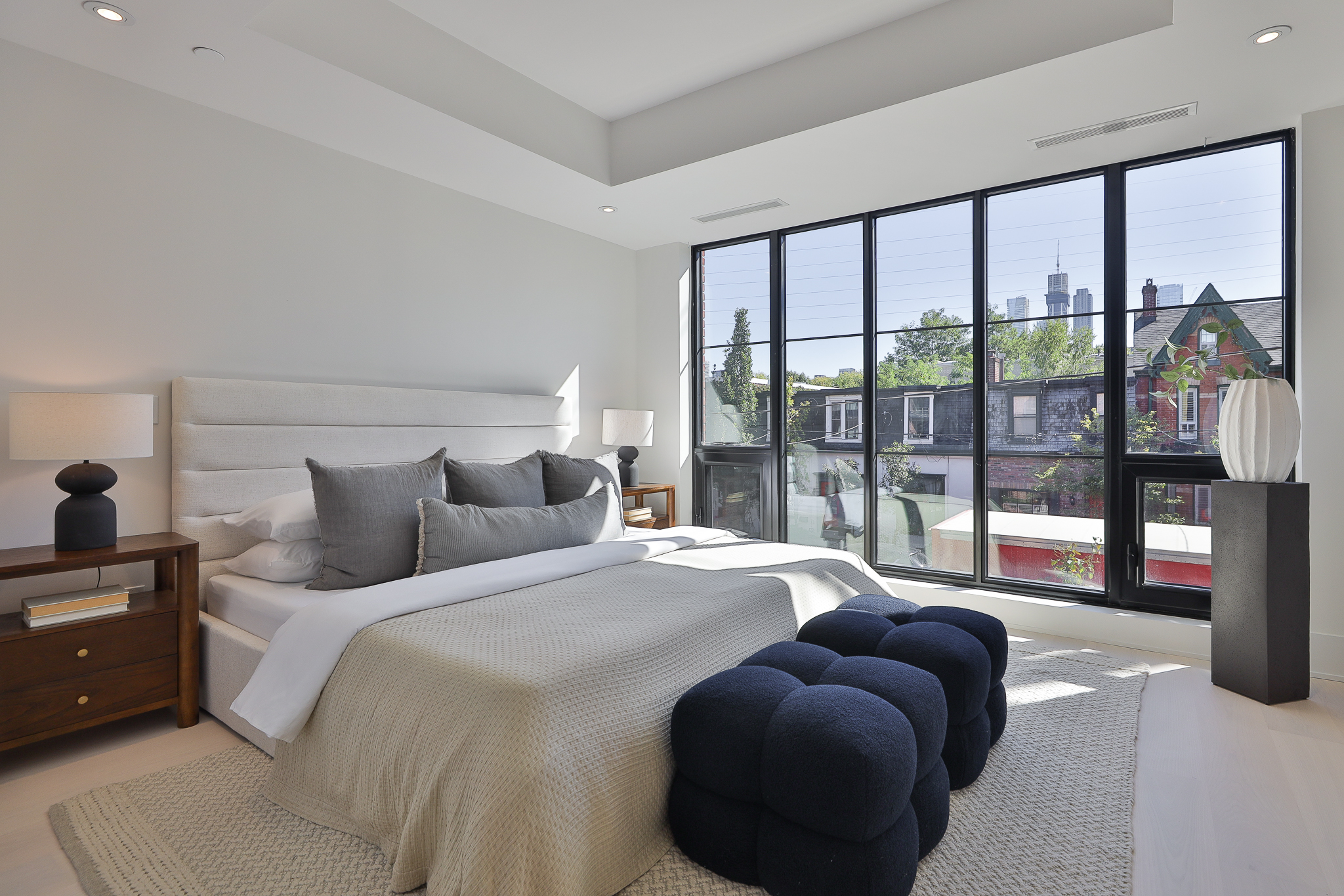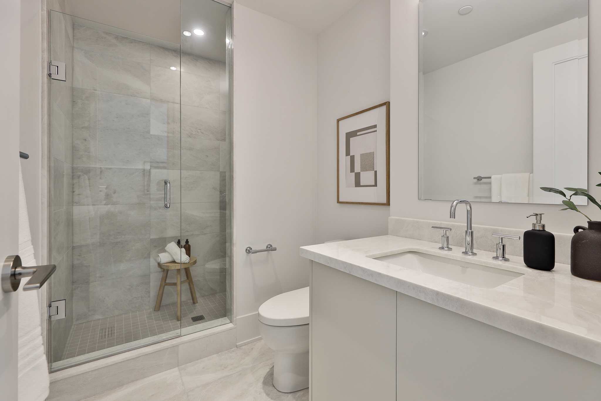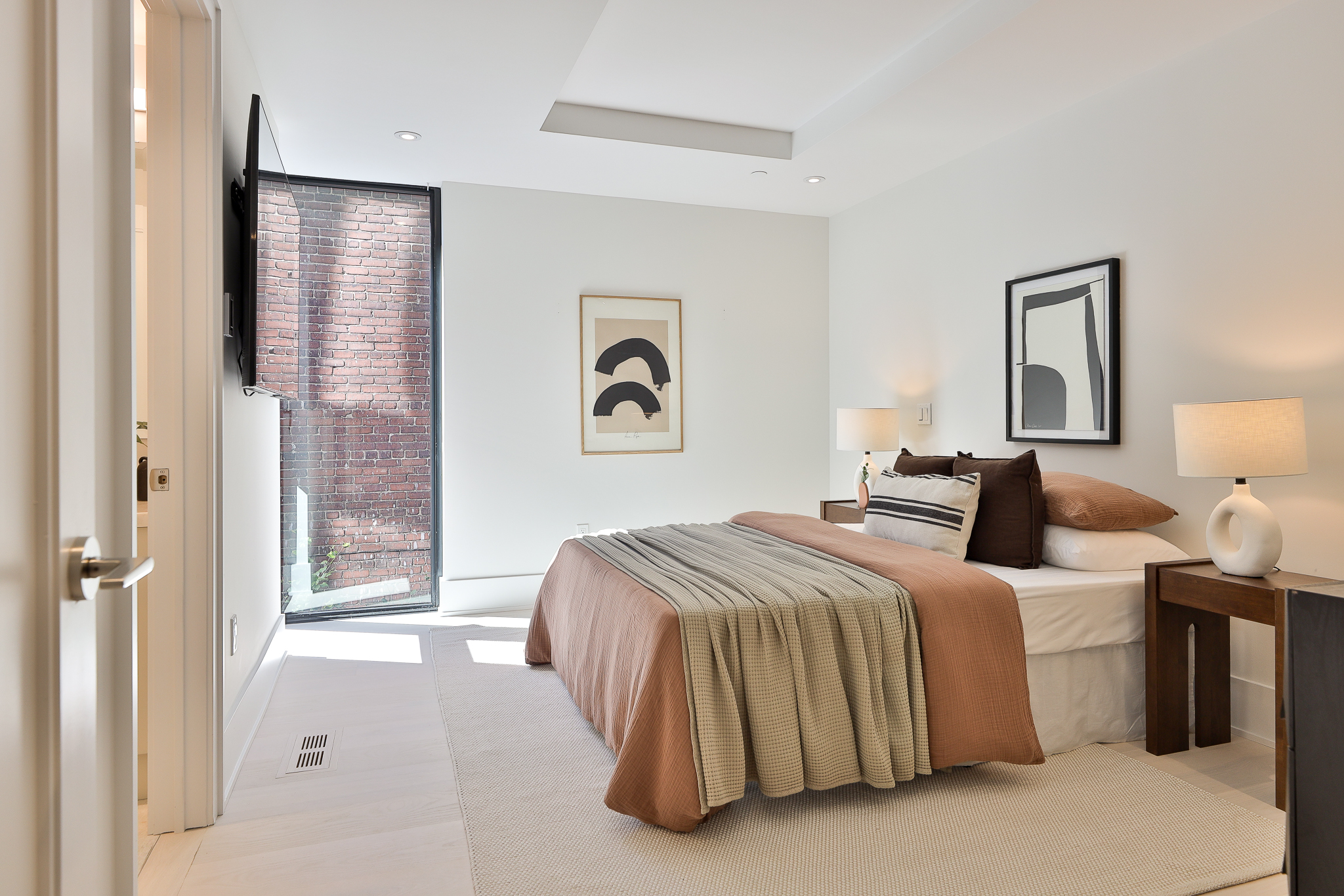 Upstairs, two full bedrooms enjoy bright southern exposure, each with thoughtfully designed storage and privacy. The primary bedroom feels distinctly serene, with abundant closet space and a spa-like ensuite that includes a deep soaker tub and walk-in shower — a true retreat in the city.
