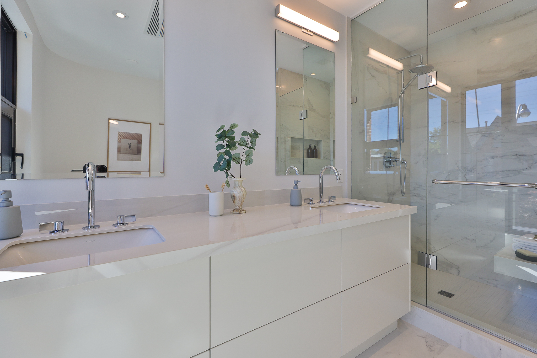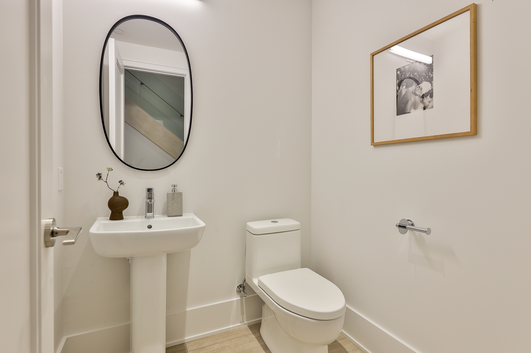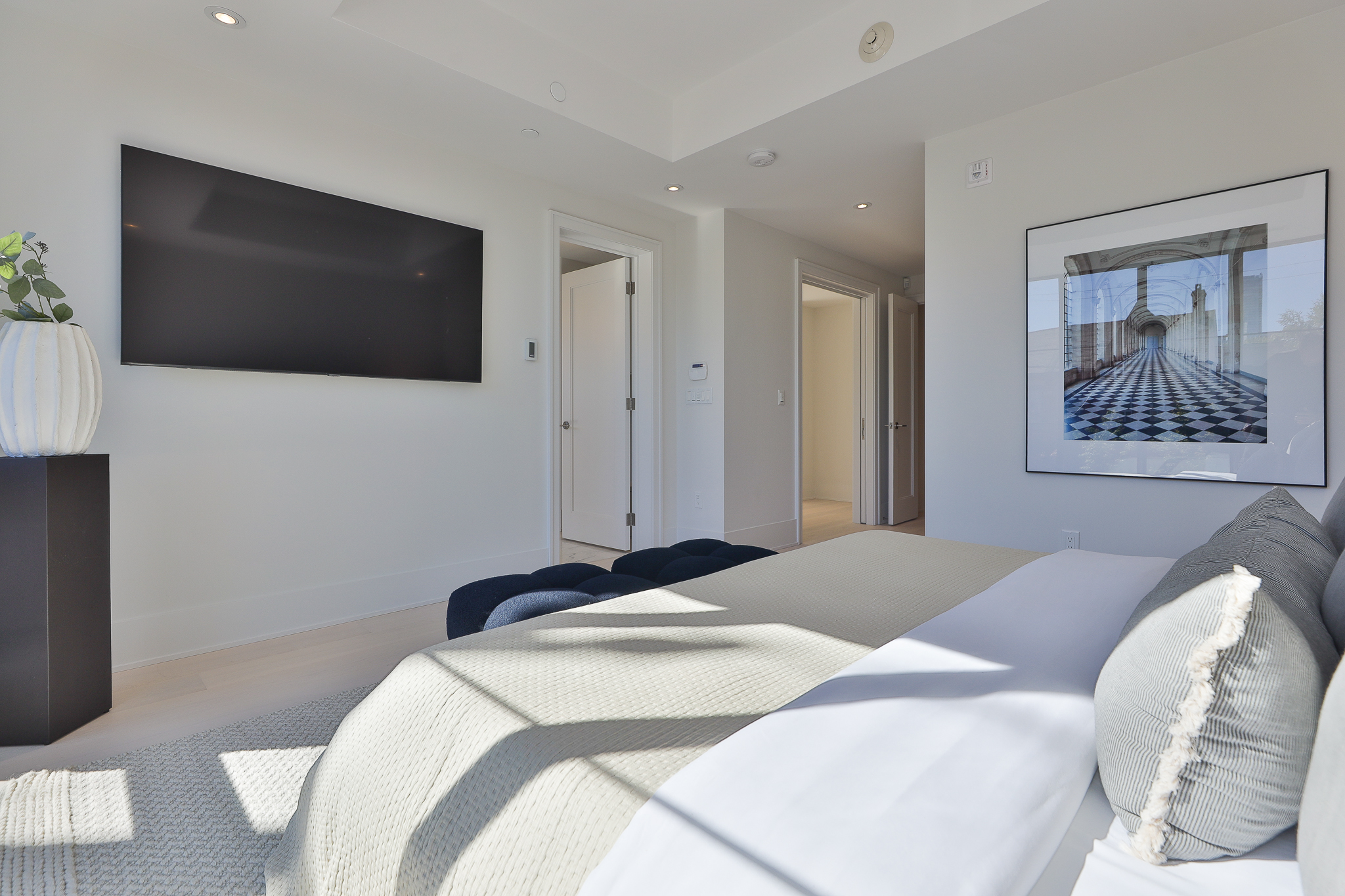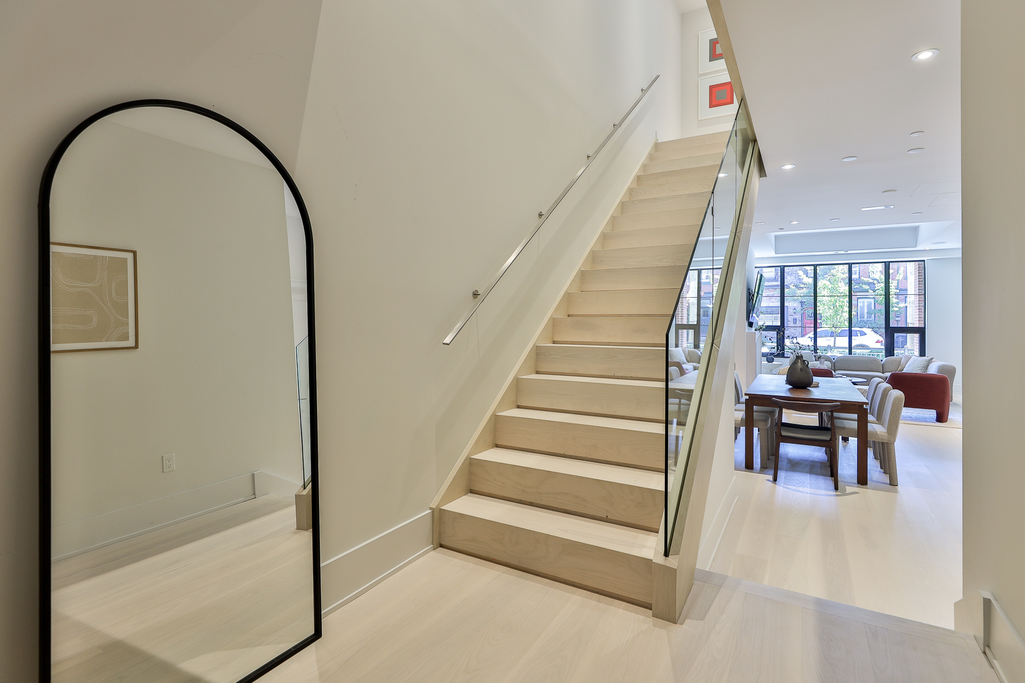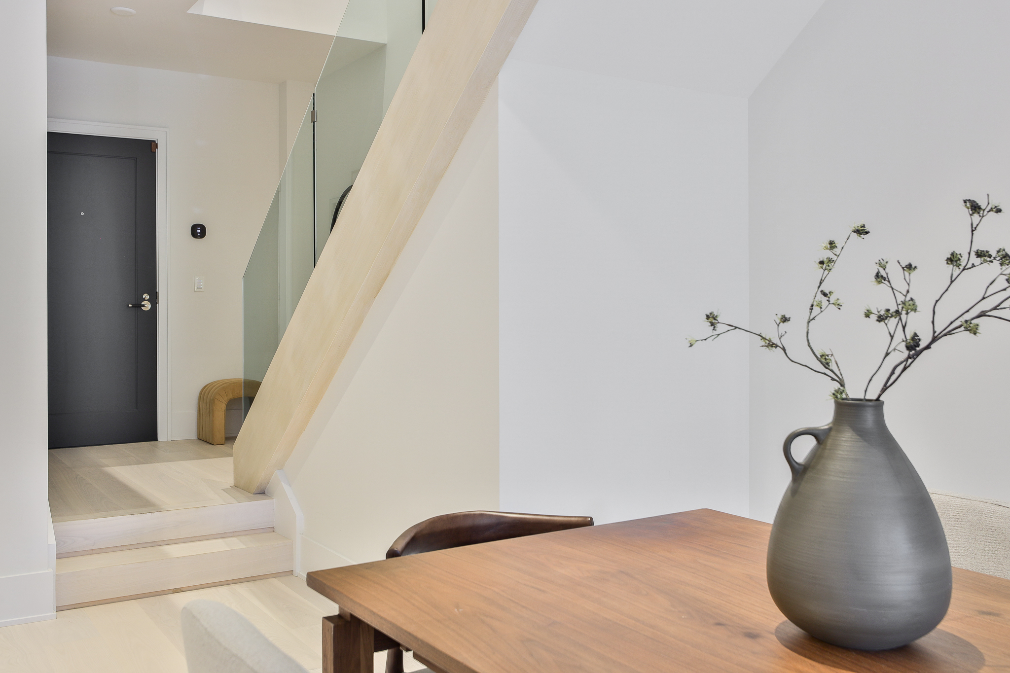 Upstairs, two full bedrooms enjoy bright southern exposure, each with thoughtfully designed storage and privacy. The primary bedroom feels distinctly serene, with abundant closet space and a spa-like ensuite that includes a deep soaker tub and walk-in shower — a true retreat in the city.