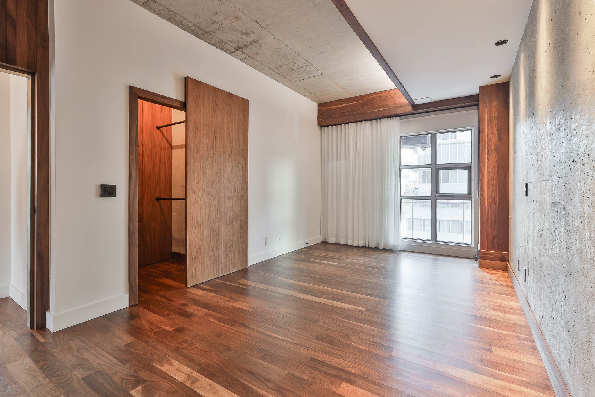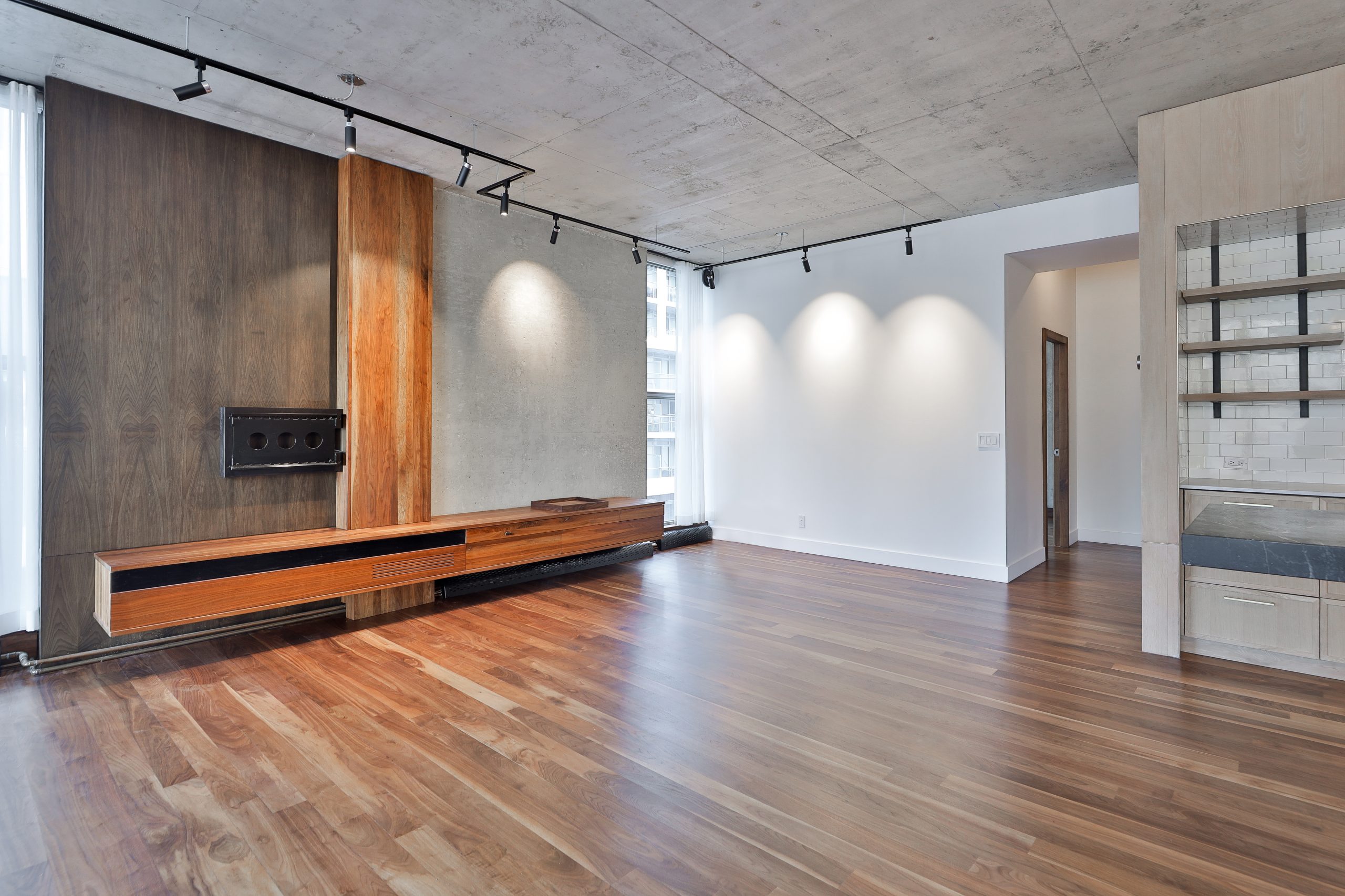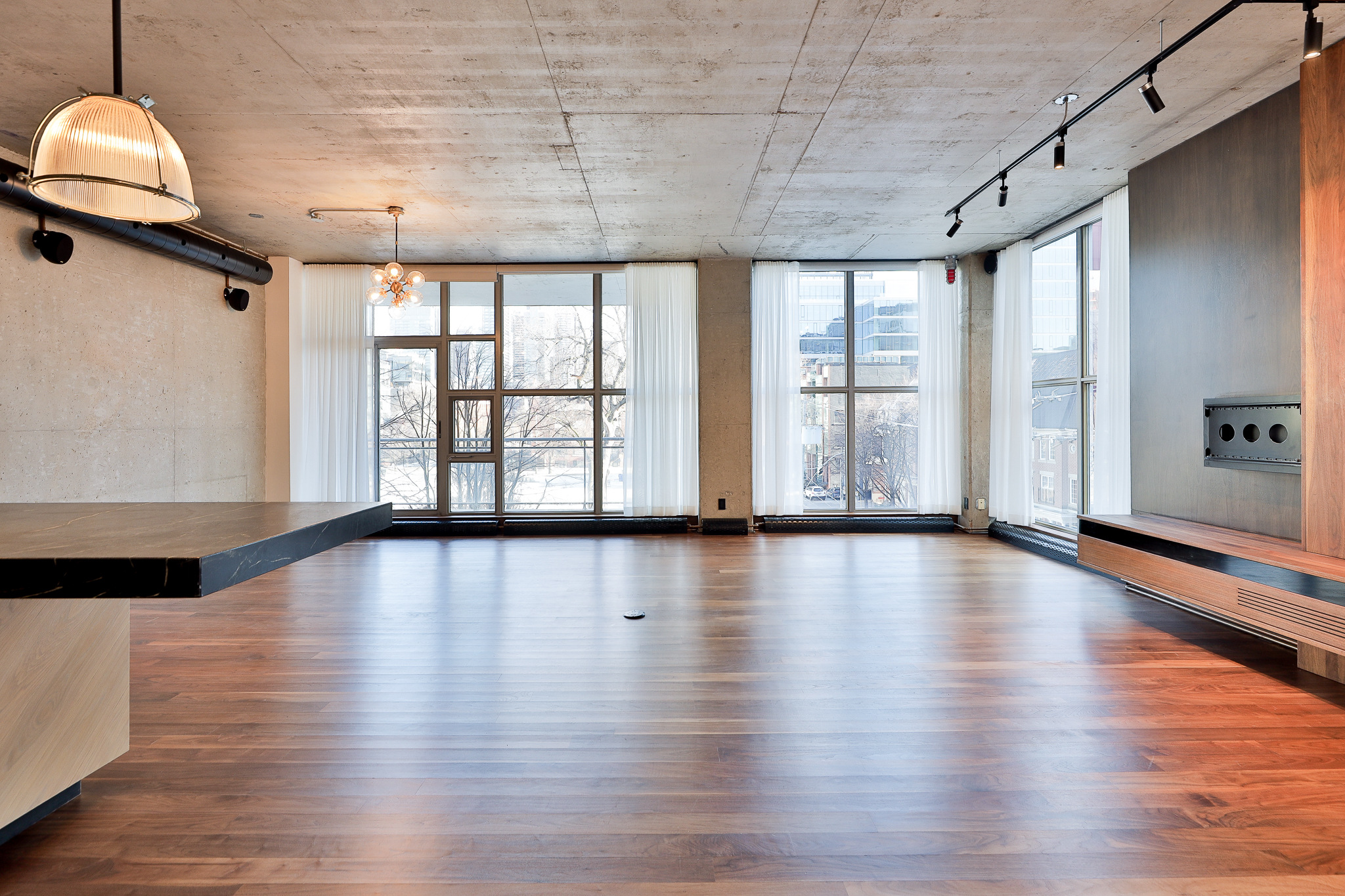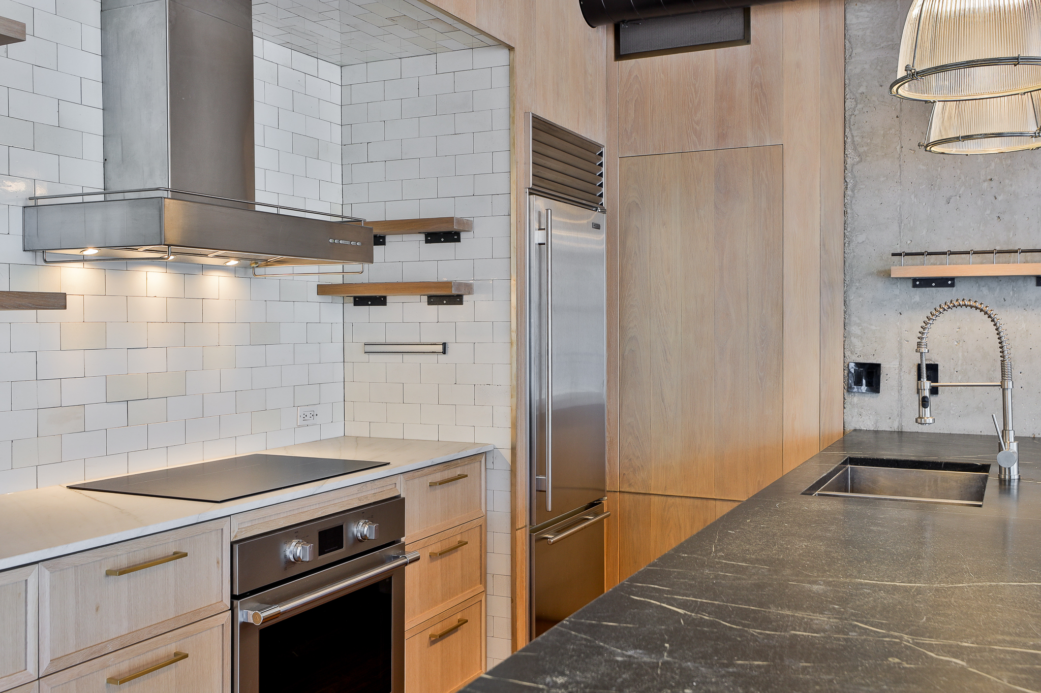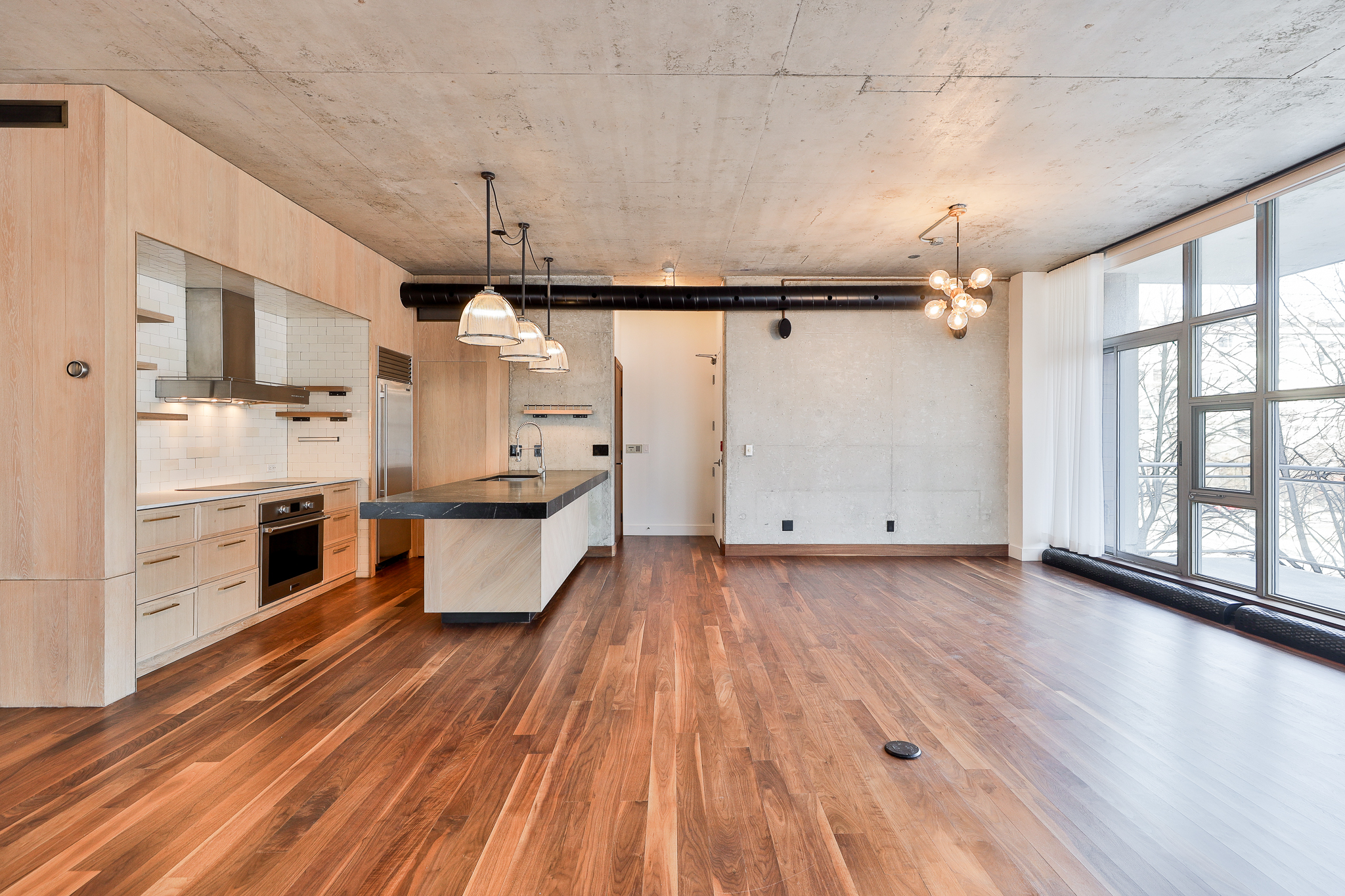Thoughtful upgrades include a custom kitchen with premium appliances and an oversized soapstone island, bespoke millwork, and warm walnut flooring, complemented by oak and exposed concrete details. Ten-foot ceilings throughout the principal rooms enhance the sense of volume, while a separate pantry with full-size laundry adds everyday functionality. A private balcony set among the treetops — complete with gas and water service — provides an ideal extension of the living space.