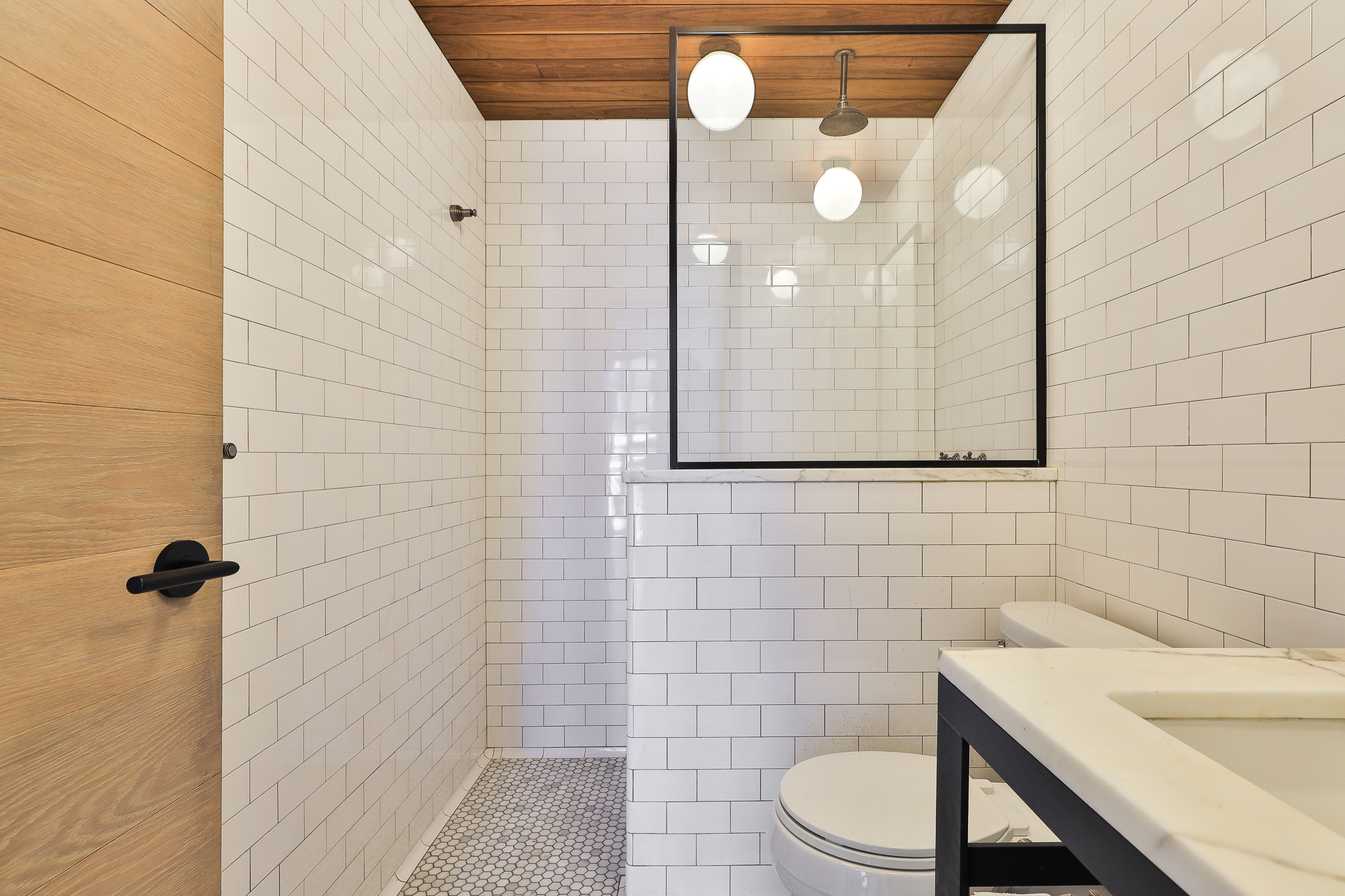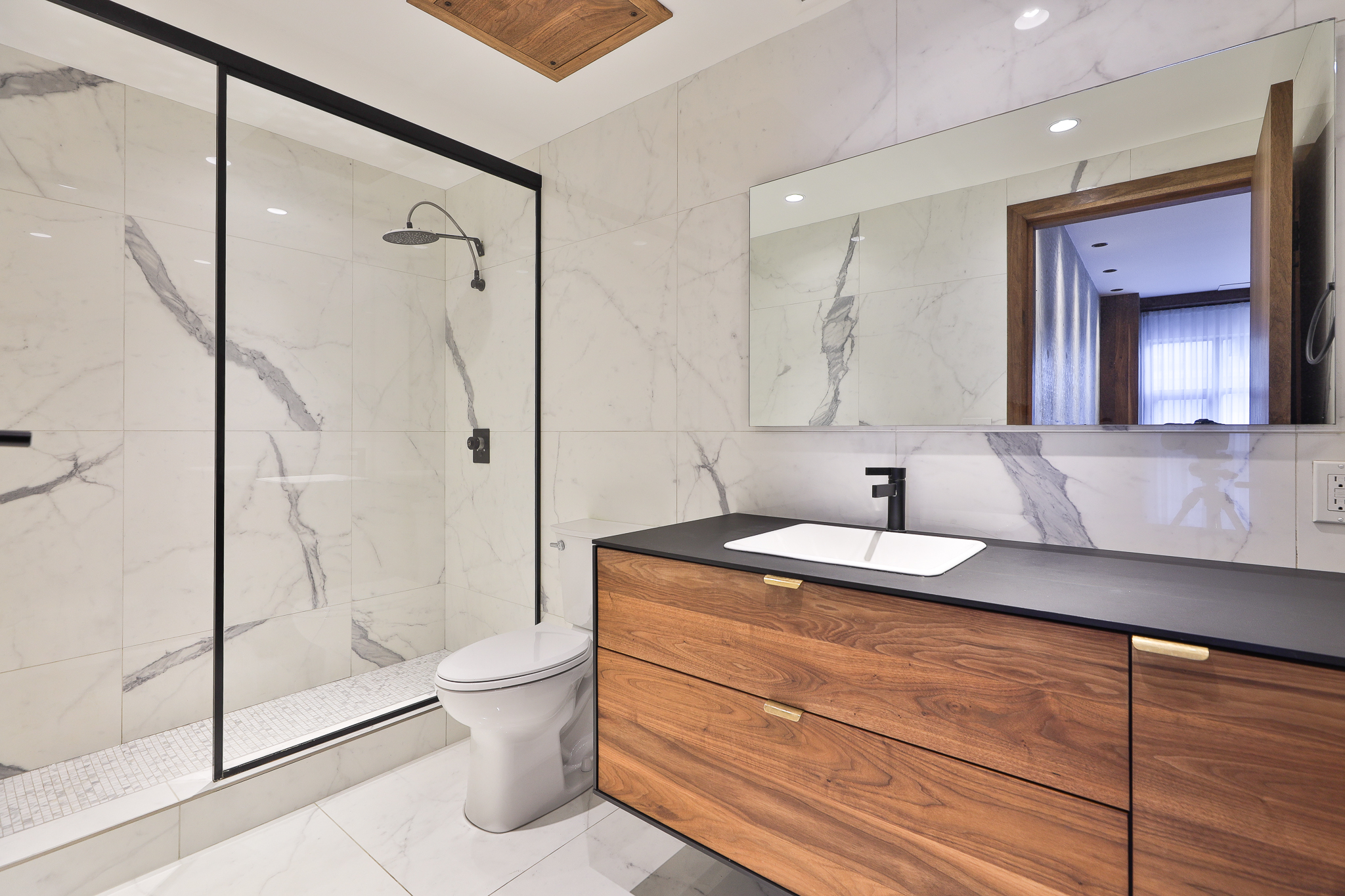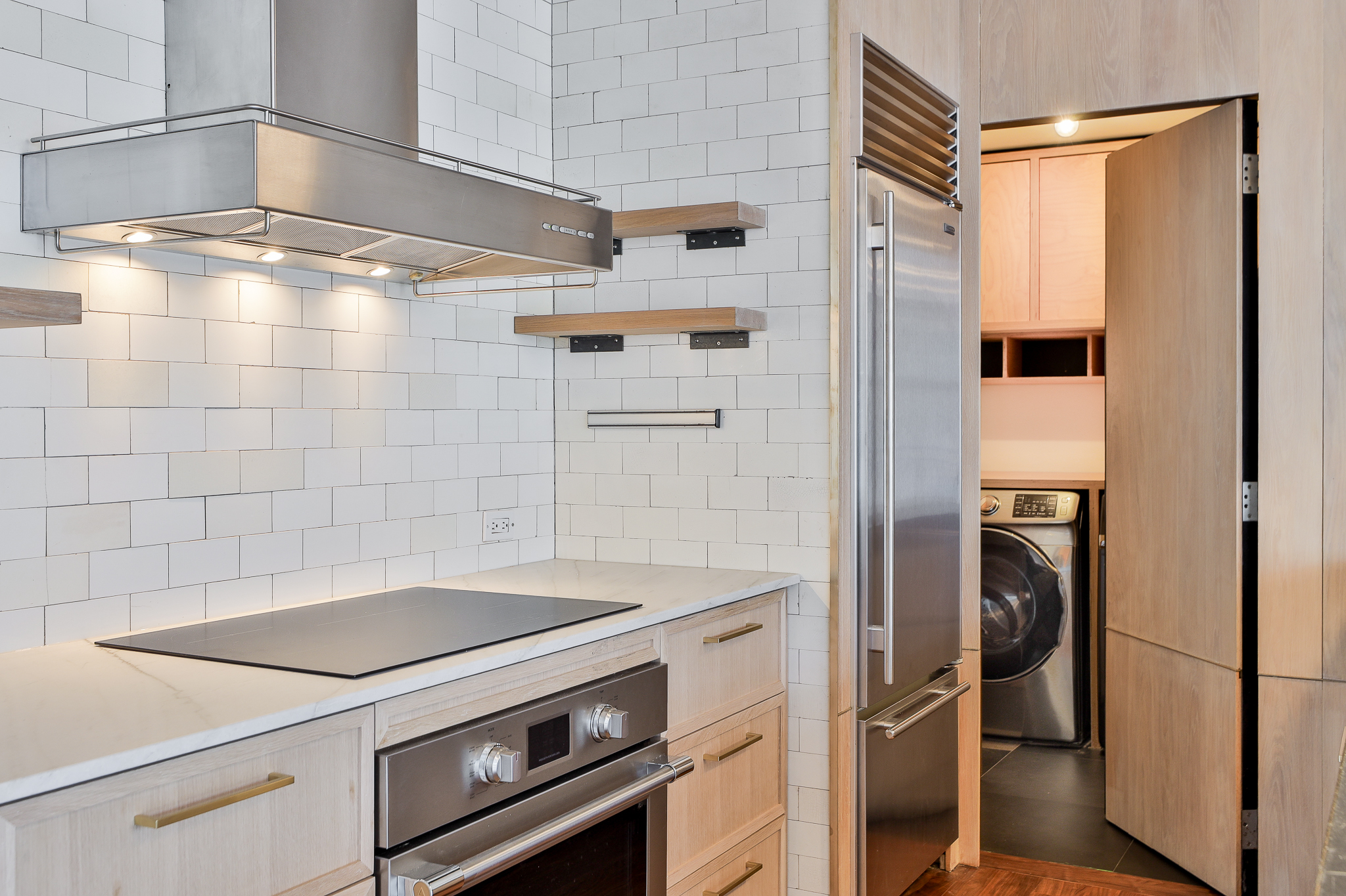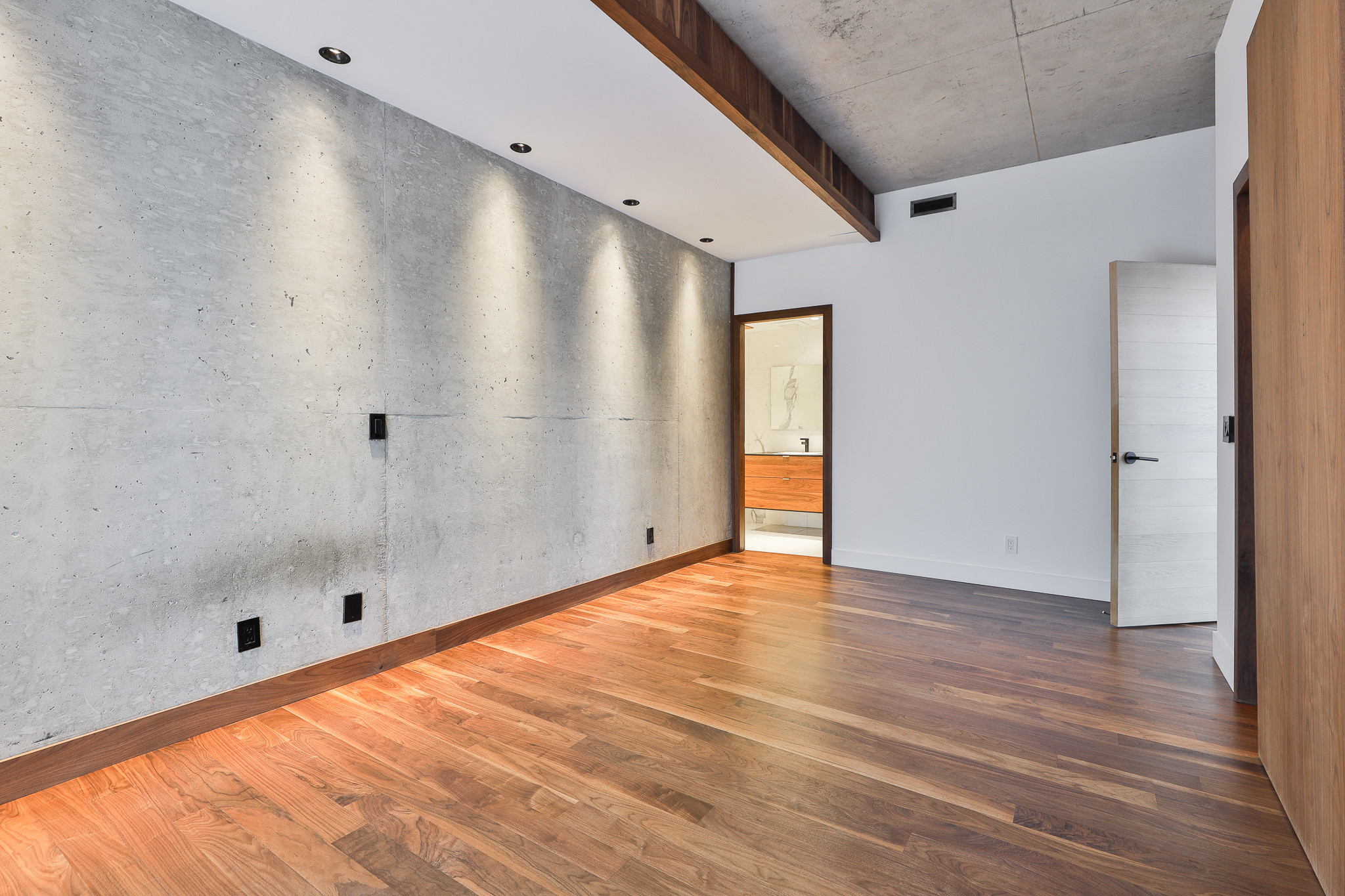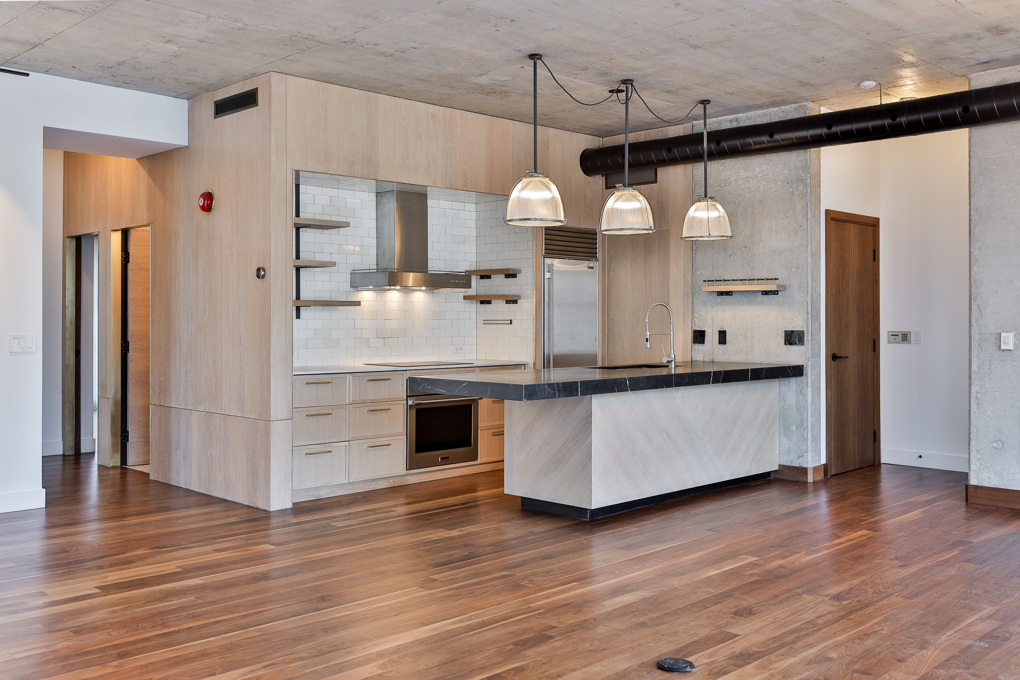 Thoughtful upgrades include a custom kitchen with premium appliances and an oversized soapstone island, bespoke millwork, and warm walnut flooring, complemented by oak and exposed concrete details. Ten-foot ceilings throughout the principal rooms enhance the sense of volume, while a separate pantry with full-size laundry adds everyday functionality. A private balcony set among the treetops — complete with gas and water service — provides an ideal extension of the living space.