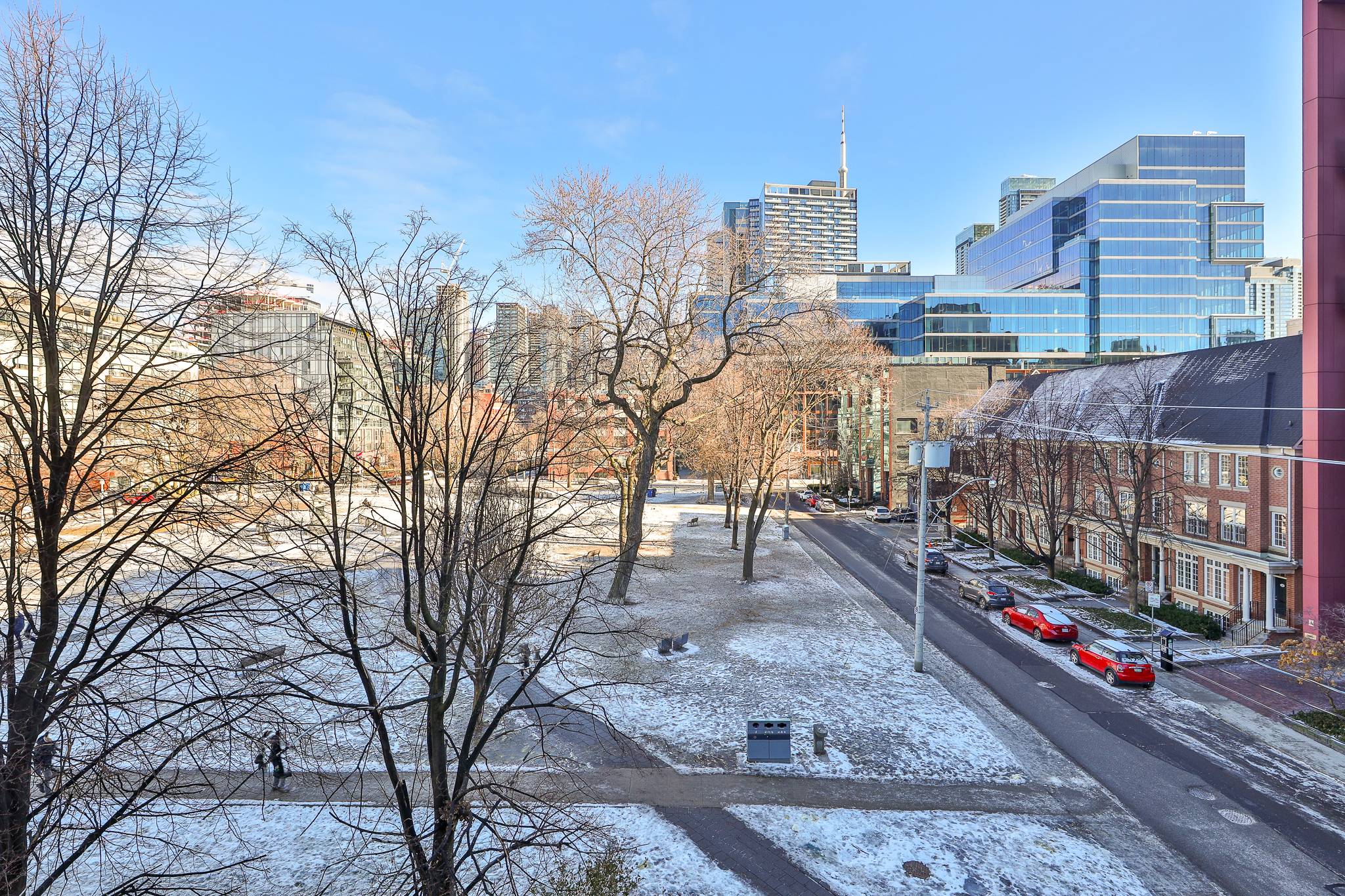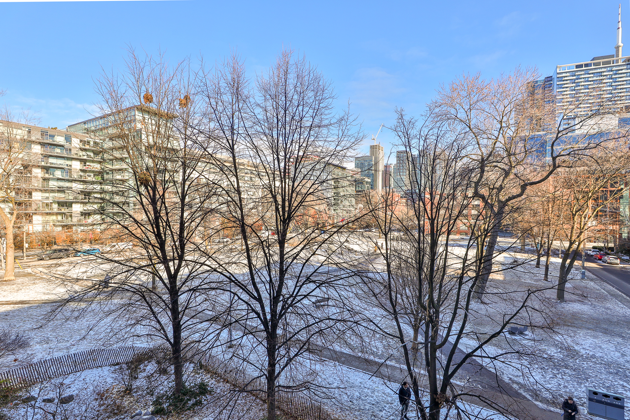 This corner two-bedroom, two-bath residence takes full advantage of its position overlooking Victoria Memorial Square, with expansive windows and unobstructed skyline views that bring the park and city into daily life. The layout is both practical and refined, offering excellent separation of space while maintaining an open, loft-like feel.